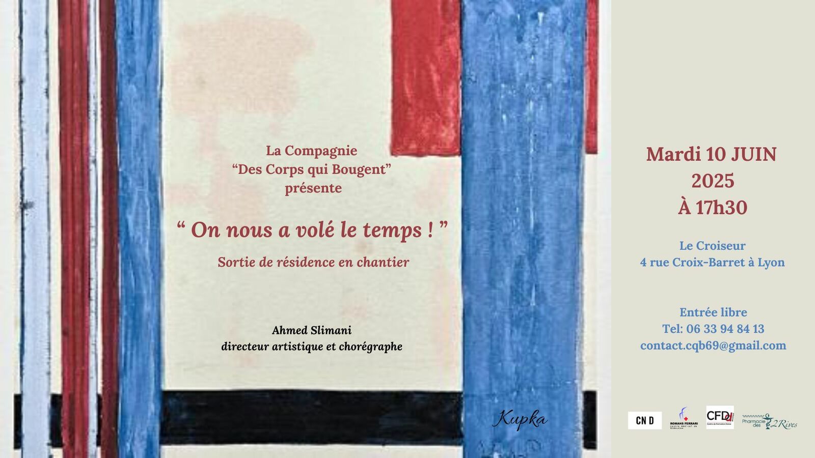 La « compagnie des corps qui bougent » et son équipe ont le plaisir de vous inviter à découvrir une première étape de travail de la pièce chorégraphique « On nous a volé le temps ! »